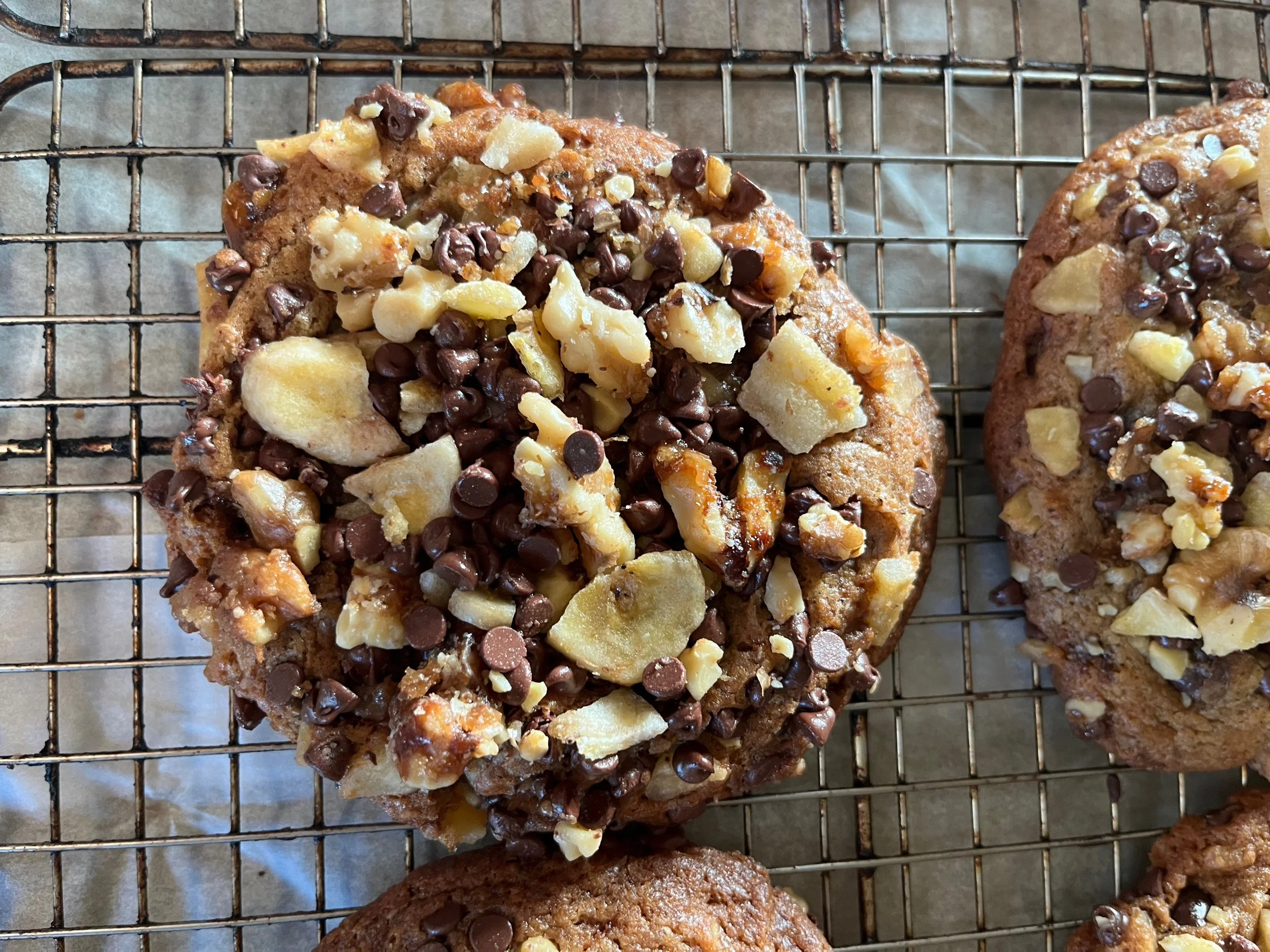 Nostalgic muffin flavors in a delicious cookie form.This banana bread chocolate chip cookie tastes like your favorite loaf turned into a handheld treat—ripe banana sweetness, melty chocolate chips, and a warm, bakery-fresh hug in every bite. Perfect with coffee, milk, or straight off the rack.